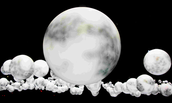 2500个“月亮”寓意扬州建城2500周年,天上的一轮明月代表2015年,另外2499个“月亮”由1个“月之眼”和2498个“月之魂”组成。“月之眼”代表公元前486年,即扬州建城之始,直径6米,高3米;每一个“月之魂”代表一年,直径0.6米,采用半透明、半镜面小球材质,形成月亮斑驳的艺术效果,看上去就像真实的月亮一样。